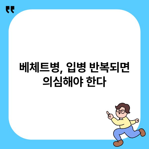 베체트병은 다양한 증상을 동반하는 만성 염증 질환입니다. 입병이 반복적으로 발생하는 경우, 베체트병을 의심해야 하며, 조기 진단과 치료가 중요합니다. 이와 함께 건강한 생활 습관과 정기적인 검진을 통해 질병 관리에 힘써야 합니다.
