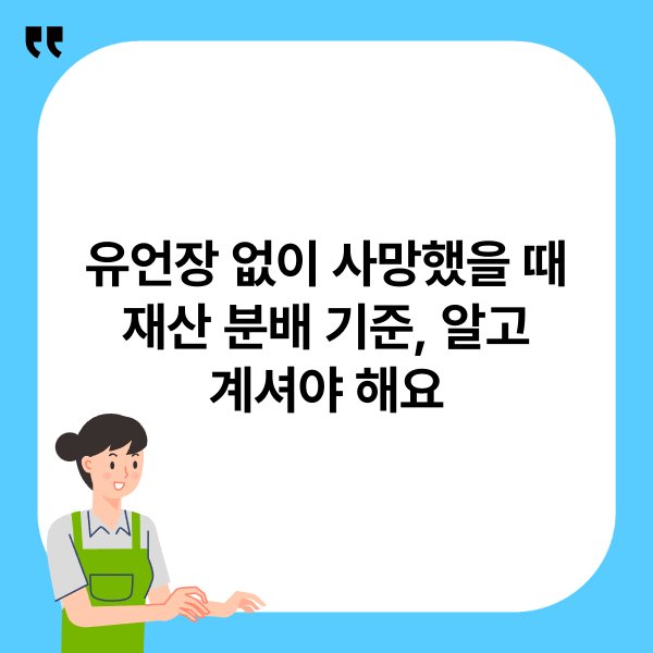 유언장 없이 사망했을 경우, 재산의 분배는 법정 상속인에 따라 결정됩니다. 배우자와 자녀가 주요 상속인이며, 상속 순위에 따라 재산이 나누어집니다. 상속 재산의 분배 비율은 법률에 명시되어 있습니다.