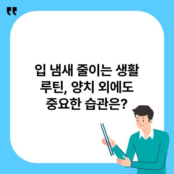 양치질 외에도 치실 사용, 충분한 수분 섭취, 구강 세정제 사용 등이 입 냄새를 줄이는 데 도움이 됩니다.
