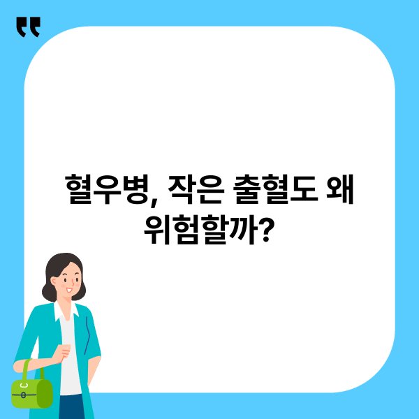 혈우병은 혈액 응고 기능의 결핍으로 인해 작은 출혈조차도 심각한 문제를 유발할 수 있는 질환입니다. 경미한 출혈이 장기적인 합병증으로 이어질 수 있으며, 이를 방지하기 위해서는 정기적인 치료와 예방 조치가 필요합니다.